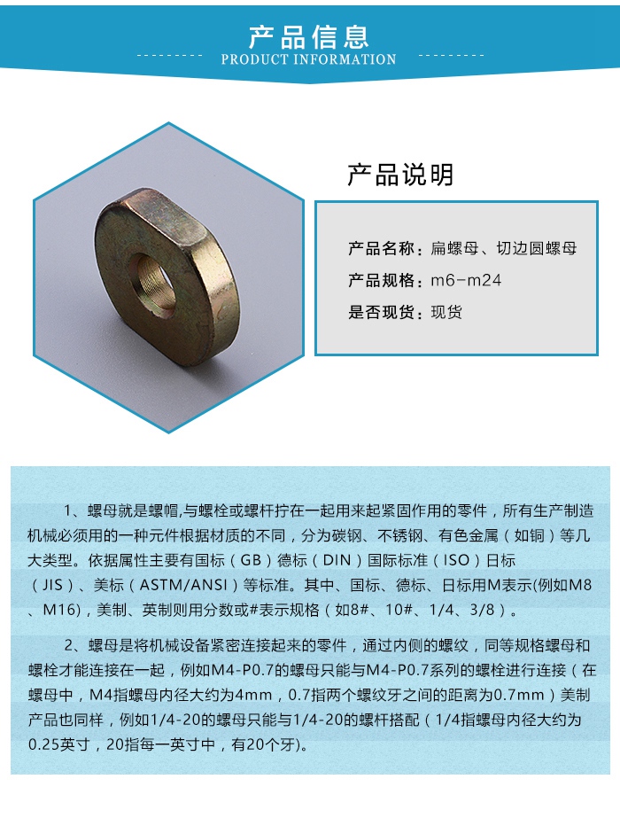 扁螺母、切邊圓螺母扁螺母、切邊圓螺母包括半圓頭、沉頭以及半圓頭方頸螺栓、沉頭方頸螺栓、帶榫螺栓 和帶棱螺栓。其中應用z多、使用z廣而且出口量z大的是半圓頭方頸螺栓(與德標DIN603相似)。這類產品屬于粗制產品,尺寸公差較大,螺紋精度不高(美國統一螺紋2A級,米制產品8g級),性能等級較低(SAE2級),一般都采用低碳鋼制造,少量采用中碳鋼制造。