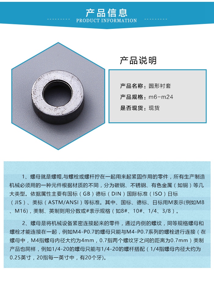 圓形襯套螺母的使用范圍大,種類也比較多,要選擇合適的圓形襯套螺母,就必須 考慮它的使用目的,不同的工況選擇不同型號的圓形襯套螺母。圓形襯套螺母選型中主要考慮的條件是圓形襯套螺母需承受的壓力、速度、壓力速度乘積及載荷性質。另外,圓形襯套螺母是否有潤滑、潤滑的狀態也決定了它的使用效果和壽命。