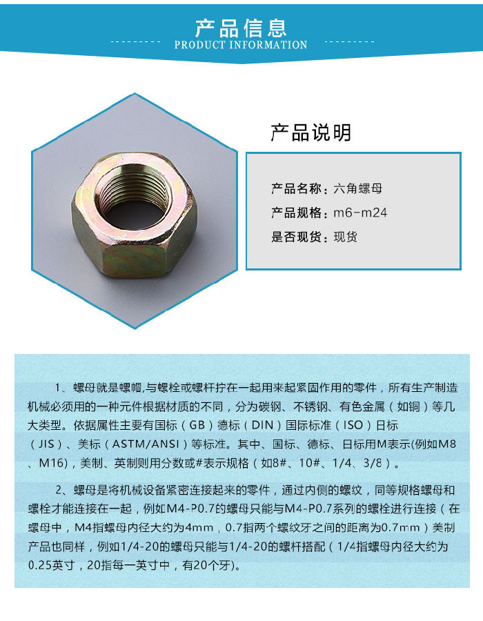 1、螺母就是螺帽,與螺栓或螺桿擰在一起用來起緊固作用的零件,所有生產制造機械必須用的一種元件根據材質的不同,分為碳鋼、不銹鋼、有色金屬(如銅)等幾大類型。依據屬性主要有國標( GB )德標( DIN )標準( ISO )日標(JIS)、美標( ASTM/ANSI)等標準。其中、國標、德標、日標用M表示(例如M8、M16),美制、英制則用分數或#表示規格(如8#、10#、 1/4、3/8 )。