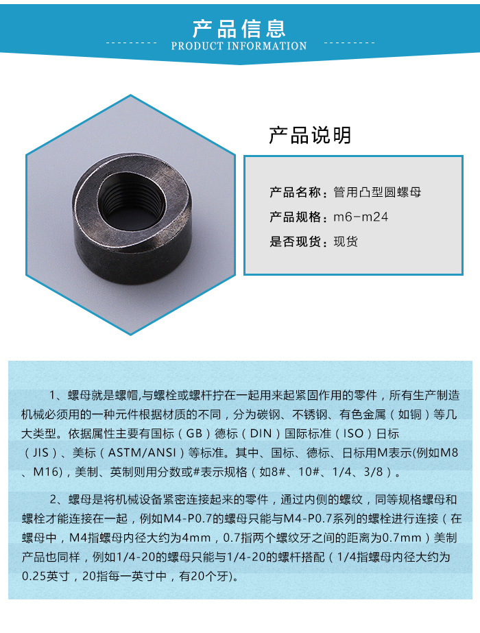 管用凸型圓螺母可以說是在我們的生活中隨處可見,當然在一定程度上說明我們的生活與其息息相關,也體現了管用凸型圓螺母的重要程度,因此對管用凸型圓螺母的要求可是額外重要。管用凸型圓螺母有四大材質:碳鋼、不銹鋼、銅質、合金。碳鋼材質的管用凸型圓螺母可以說是不叫大眾化,也是用量z多的一種,呈黑色狀,整體較為堅硬,不銹鋼材質的管用凸型圓螺母,則多是運用在一些電子行業、船舶工業、汽車行業等,因其不易生銹的原因,運用的領域算是不叫了,銅質管用凸型圓螺母可以說是專用于煤礦、電力等需要防爆的領域,合金鋼材質因非常的堅硬耐用,在鐵路交通、采礦設備、石油鉆井則是廣泛使用的一種。