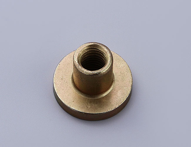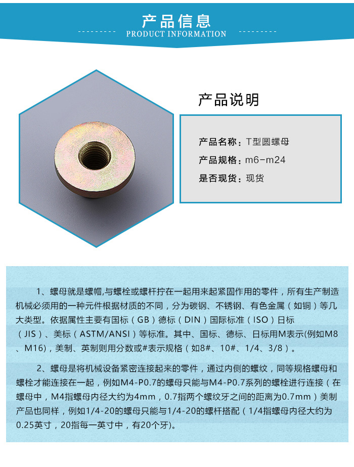 T型圓螺母包括一結構主體,該結構主體為一圓環,于產品的圓環內圈設置多組螺紋,產品的圓環包括組合連接的圓帽及支柱,產品的螺紋為倒梯形的右旋螺紋。通過內圈梯形凹槽組成螺紋,無需緊固件配合便能實現擰緊固定,結構簡單,便于大規模推廣使用,且成本低,節約資源,滿足不同領域及特殊場景的使用。